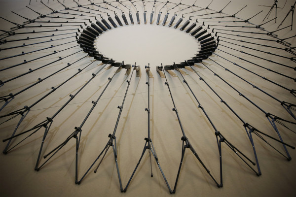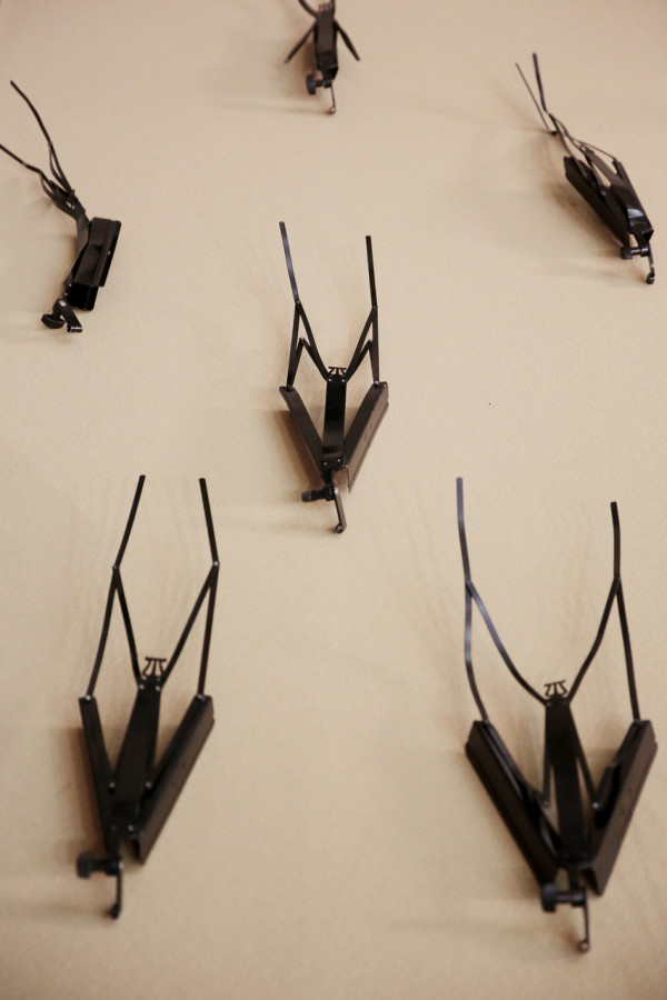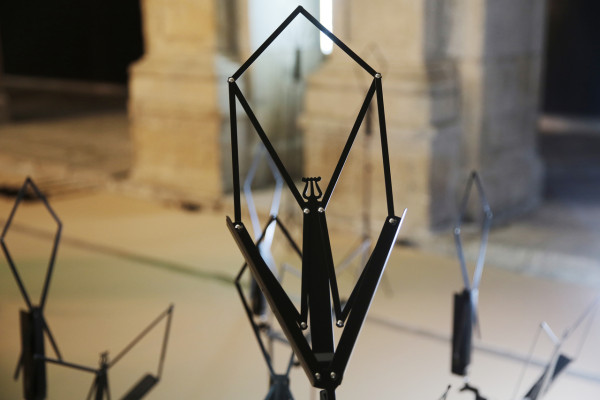 As estantes de partitura – que já manipulava em “Bacantes” – são objetos de pedestal, compostos por partes diversas com dimensões e formas variadas, ligadas entre si através de rótulas, como as marionetas que, por sua vez, são feitas à semelhança do esqueleto animal ou humano. As estantes de partitura são corpos desdobráveis com o propósito de servir de apoio à partitura dos músicos, que tocam ou cantam. A sua forma e função são aparentemente indissociáveis, a não ser quando Marlene lhes atribui novos significados e usos, desde logo extraindo-lhes qualidades antropomórficas.