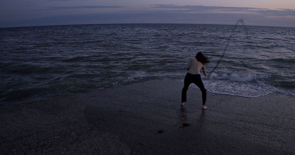 No vídeo, uma mulher, nua da cintura para cima, vestida simplesmente com calças de fato treino, longos cabelos negros, com os pés mergulhados à beira mar, onde as ondas rolam na areia, empunha um chicote. Eliza Douglas é a performer dessa visão que emoldura o corpo feminino, desafiador, batendo as ondas do mar, diante da imensidão desse horizonte de águas rebeldes.