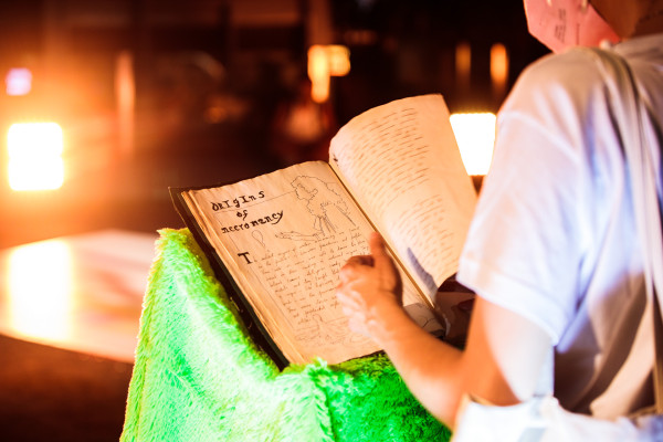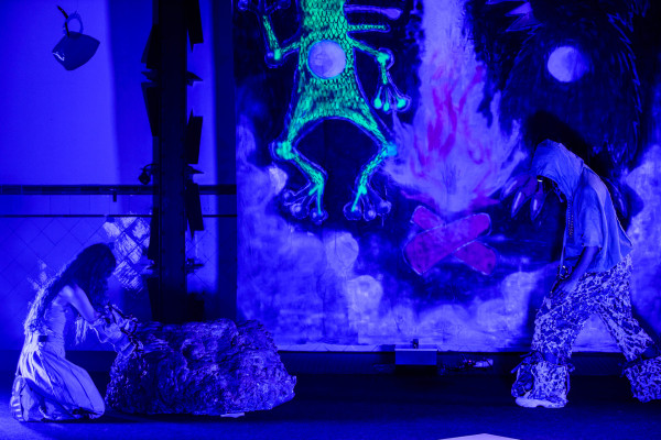 “On Revelations and Muddy Becomings” é composto por três elementos – um livro mágico, um videojogo e uma performance – que se relacionam entre si e conta com a colaboração e interpretação de Tita Maravilha, Herlander e da própria Odete. Passado num arquivo futuro do planeta Terra, esta peça cria e habita um território ficcional onde a arqueologia é implicada, onde o corpo ancestral é trazido para o presente somaticamente, onde os poemas são rituais e onde os fantasmas têm lugar para rir. Entre óleos e dildos mágicos, deusas hermafroditas e viagens interplanetárias, xs performers cuidam-se entre si, revelando talvez uma comunidade para além das verdades da história.